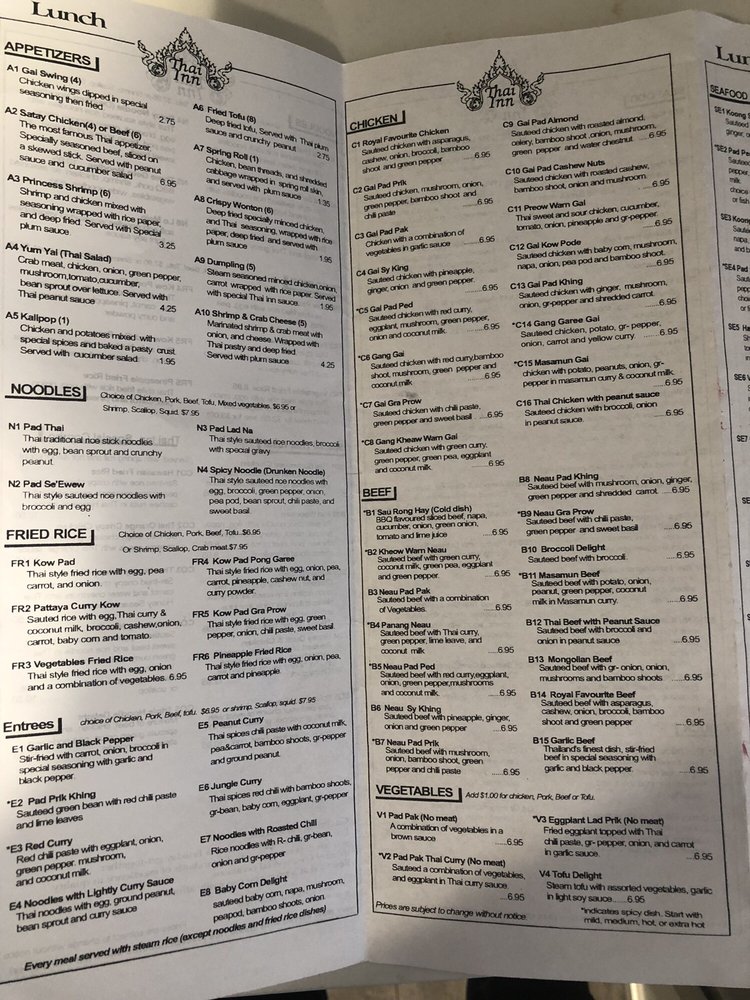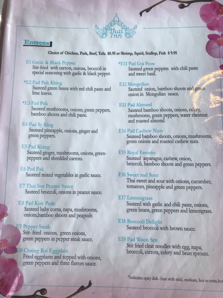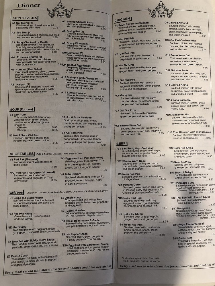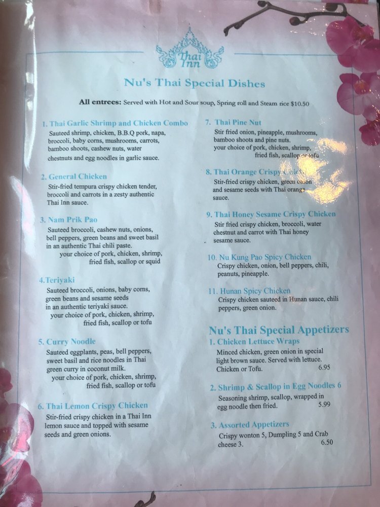 Introducing the menu at Thai Inn, located in Rochester Hills, MI, this casual yet quiet spot offers a range of Thai delicacies. From savory appetizers like Tod Mun and Stay Beef to flavorful soups like Hot and Sour Chicken and Hot and Sour Seafood, Thai Inn has something for everyone. Vegetarians can indulge in options like Eggplant Lad Prik and Pad Pak Thai Curry. The reviews speak for themselves, with customers praising the delicious Gang Gai and the generous portion sizes. With exceptional service and high-quality food, Thai Inn is a hidden gem that keeps customers coming back for more. Don't miss out on their must-try dishes like Garlic Noodles with Chicken, Curry Noodles, and the famous Crab Rangoon. Enjoy the best Thai cuisine in Rochester Hills at Thai Inn.